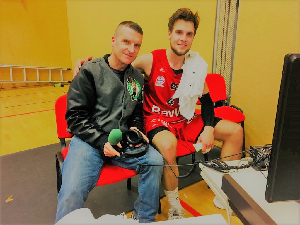 Miles Schmidt-Scheuber interviewing Swedish shooting star Elijah Clarance who led the Fraport Skyliners with 21 points in the win