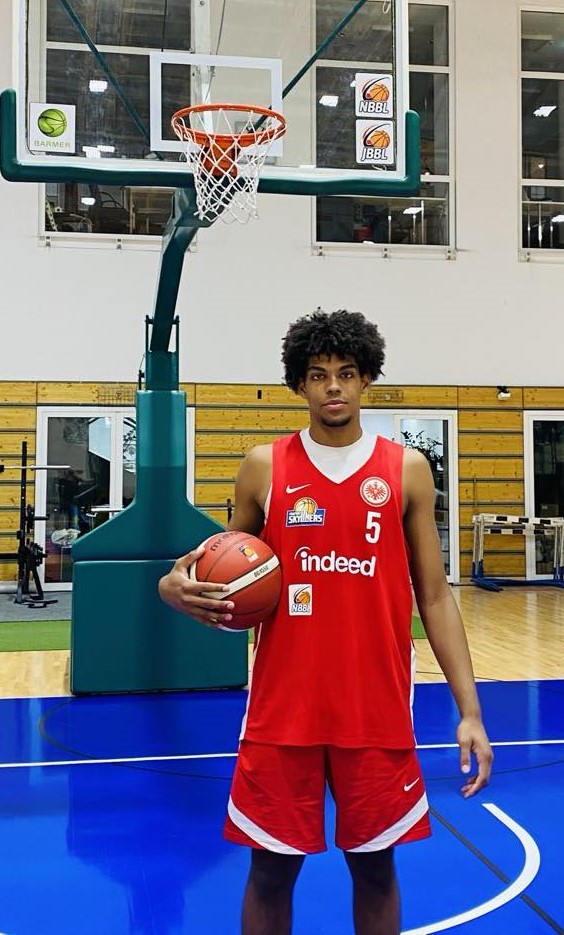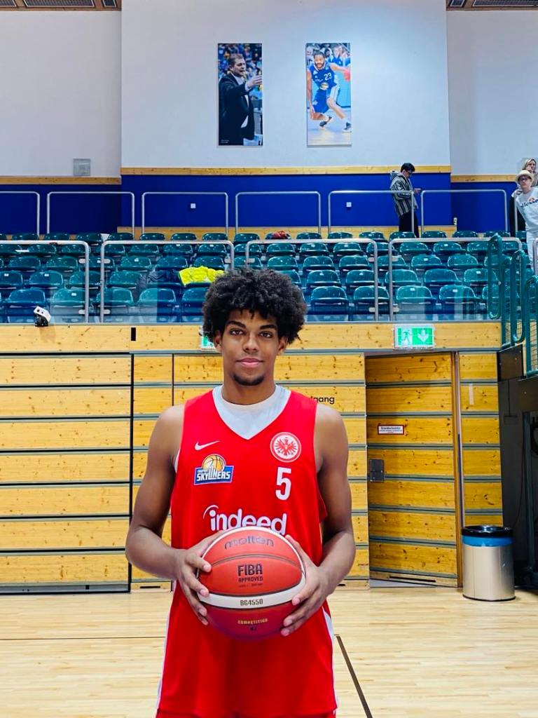The 17 year old German who lists current Georgia (NCAA) Bulldog and Serbian youth national player Savo Drezgic as his toughest player so far in his career was born on Jan 17, 2008 and grew up in Kirchheimbolanden which is near Mainz. He picked up the basketball for the first time at age 8, but didn´t seriously begin to play the game until he was 12 years old. He began his basketball career with TV Kirchheimbolanden. It is no surprise that he didn´t have a easyCredit BBL player or top German player as his role model growing up. It is often that the young kids are excited about the NBA and the unique and electrifying players that they have to offer. He watched a lot of NBA and to no surprise his big role model was Lebron James who then was playing with the Cleveland Cavaliers. He then joined the Skyliners organization and began with the U-14 youth team. “I liked the program right away. In my first year I was going back and forth between my home Gollheim and Frankfurt. I really enjoyed the professionalism of the club”, said Jamie Edoka. Last season he made his NBBL debut at age 15 and played 7 games averaging 5.3ppg, 1.9rpg, 2.0apg, 2.1spg, FGP: 52.4%, 3PT: 10.0%, FT: 60.0%. His best scoring games in the NBBL were 8 points twice against Wurzburg and he registered 6 steals against Heidelberg. He also got his first taste of the Pro B where he played 2 games and also made his debut at age 15 playing 10 minutes against Speyer. He was really fortunate to have been able to practice with veteran Alvin Oniya who played in the NBBL back in 2016 with future NBA and world champion Isaac Bonga. “Alvin was always a mentor for me. He always had a strong personality. I really liked how he played and learned a lot from him. The most vital thing that I learned from him was decision making”, commented Jamie Edoka.